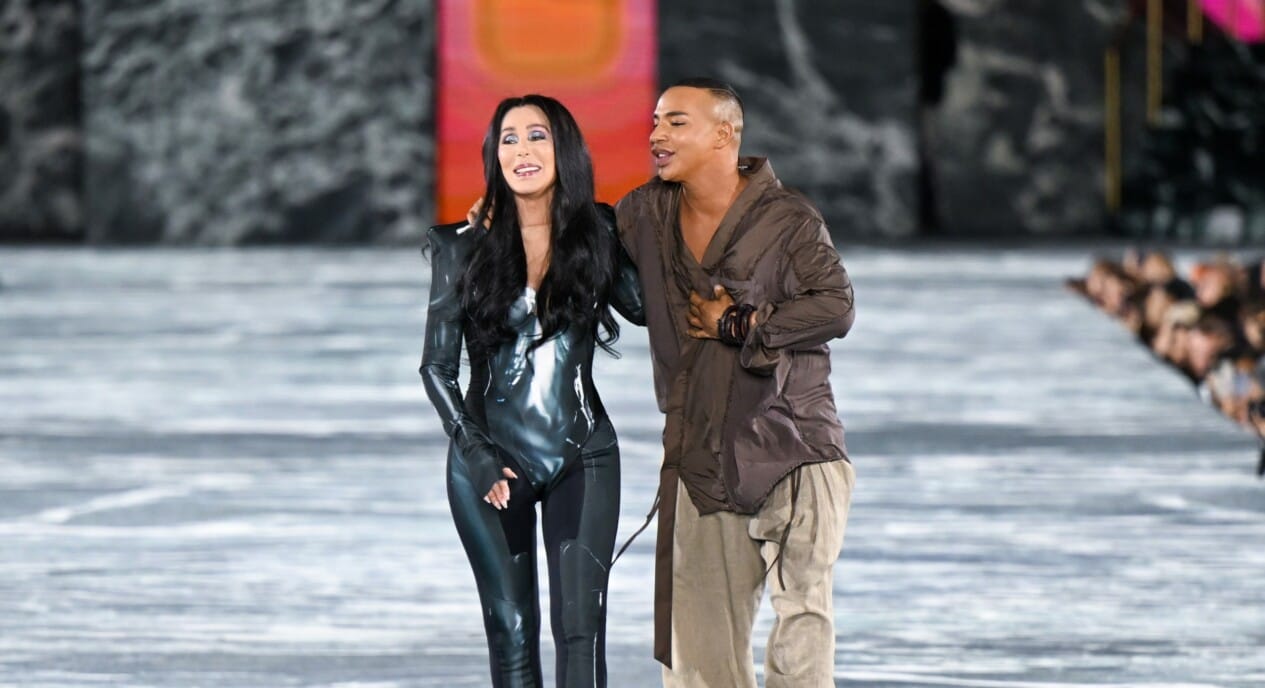 El espectáculo arrancó con una proyección de Cher, pero, para sorpresa de los espectadores, no se trataba simplemente de una imagen digital: el icono de los 80 saltó a la pasarela al cierre de la misma para clausurar el desfile de la mano de Rousteing.