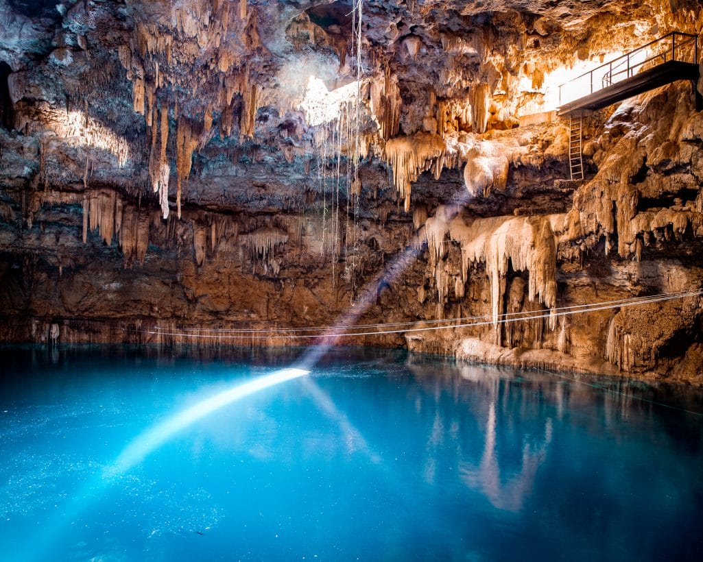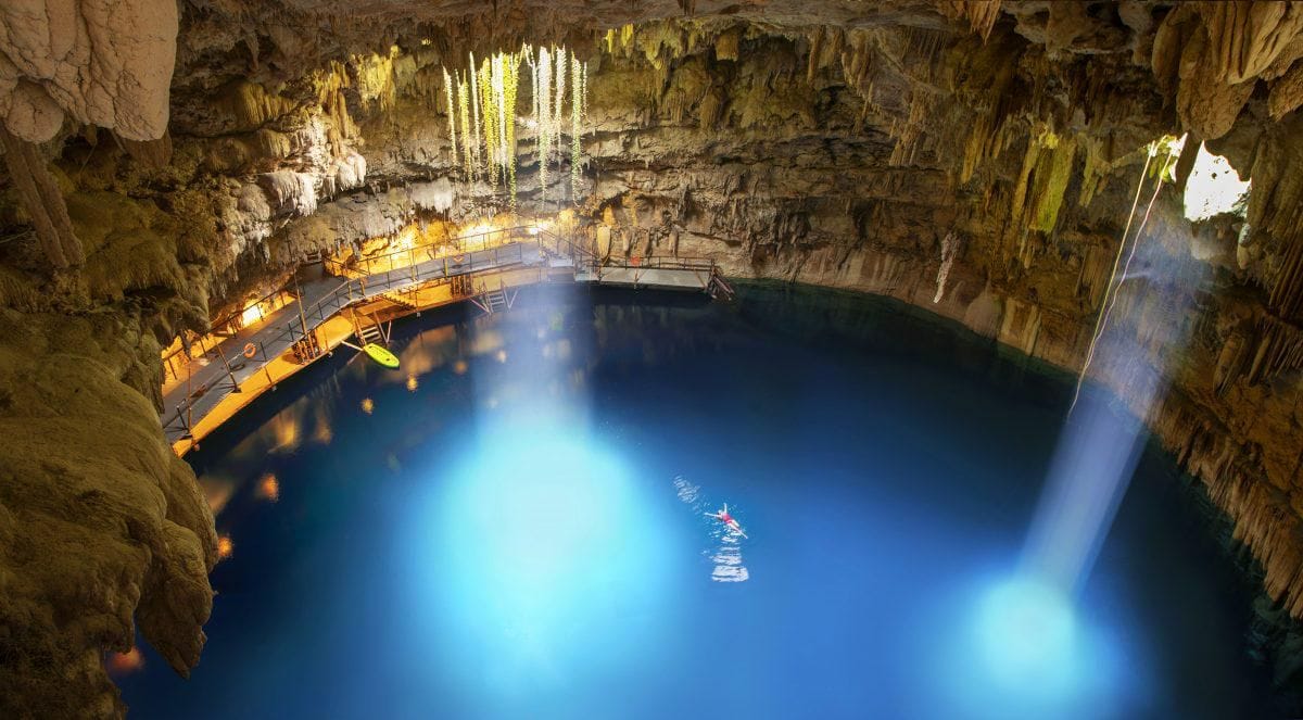 El cenote Suytun es una caverna con una abertura en la parte superior, por la cual entran los rayos del sol iluminando la infraestructura increíble con la que cuenta y sus aguas cristalinas poco profundas (5 metros en la parte más honda). Lo puedes visitar de lunes a domingo en un horario de 9:00 a.m. a 5:00 p.m.