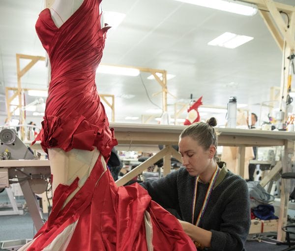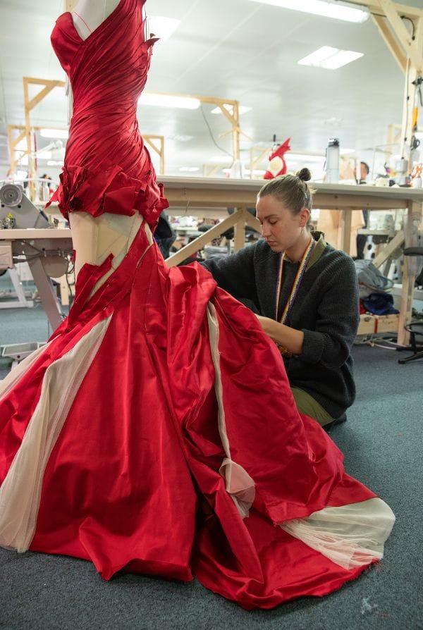 La protagonista usó 47 atuendos distintos, entre ellos uno que incluye una falda de pétalos rojos confeccionada a mano en su totalidad y que tiene más de 300 metros de tela. Resultaba tan monumental, que la primera versión de él ni siquiera podía ser llevada por la actriz debido al peso del vestuario.