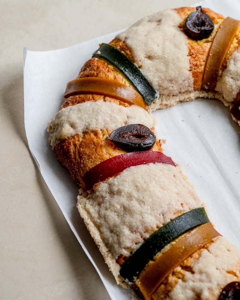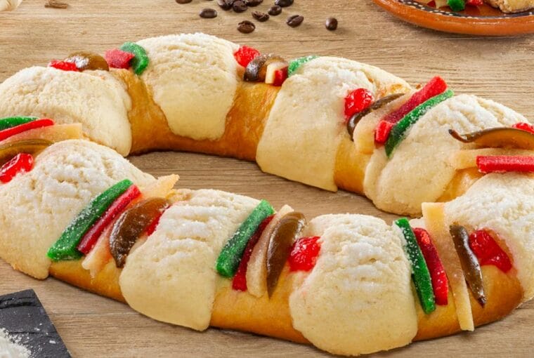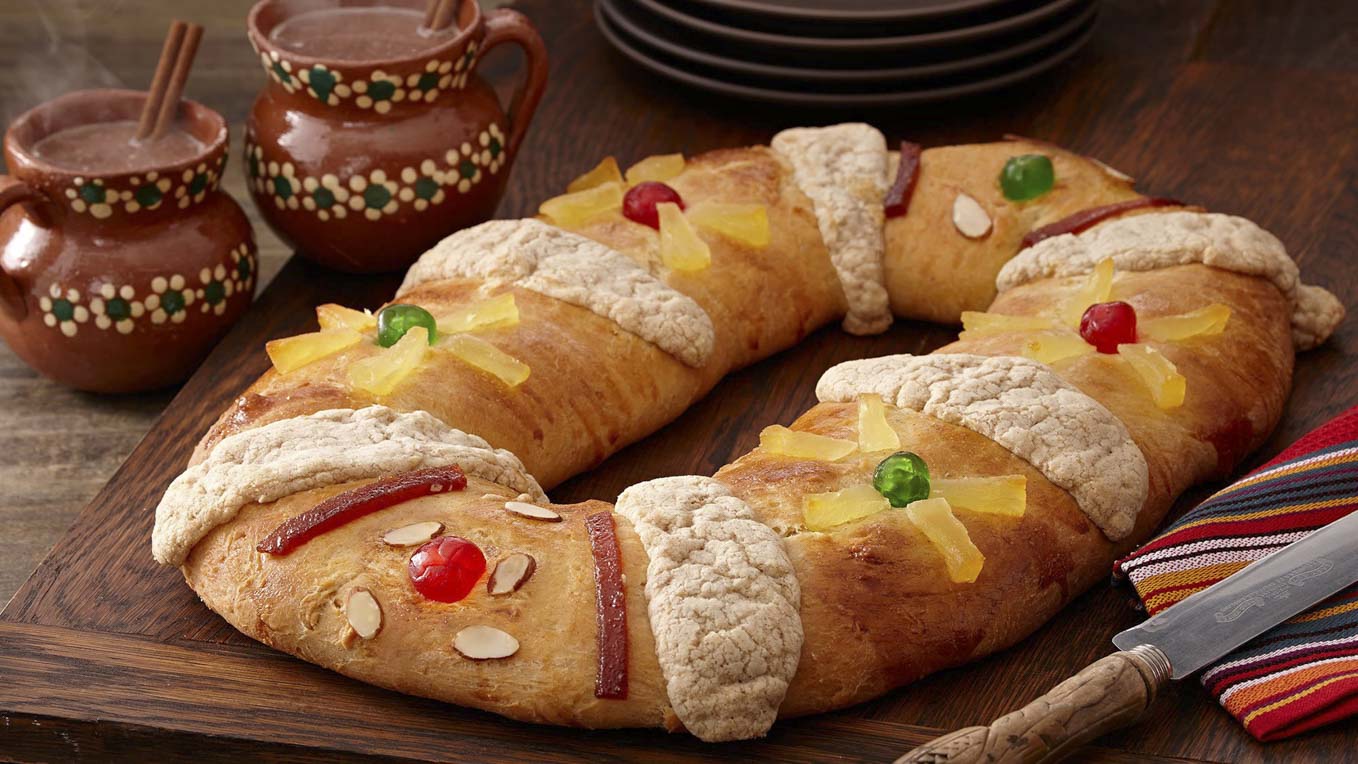 La Rosca de Reyes es un pan en forma oval elaborado con masa dulce, adornado con rodajas de fruta confitada, escarchada o cristalizada de varios colores (también conocido como dulce ‘acitrón’) y trae en su interior uno que otro ‘muñequito’ oculto.