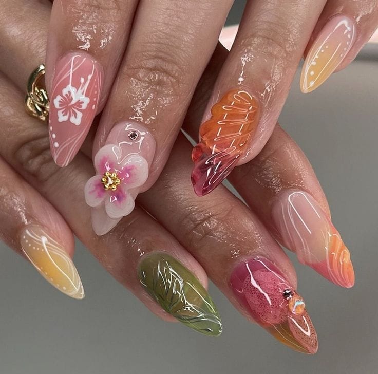Si te gusta mucho experimentar con los diseños de uñas, el verano es el mejor momento para hacerle cara a atreverte a fusionar colores, texturas y formas. El verano se presta mucho a utilizar colores como el naranja, amarillo, rosa o verde. Y por si fuera poco, ahora más que nunca puedes pedir que te agreguen algún relieve o figura en 3D para poder darle una dimensión especial a tus uñas.