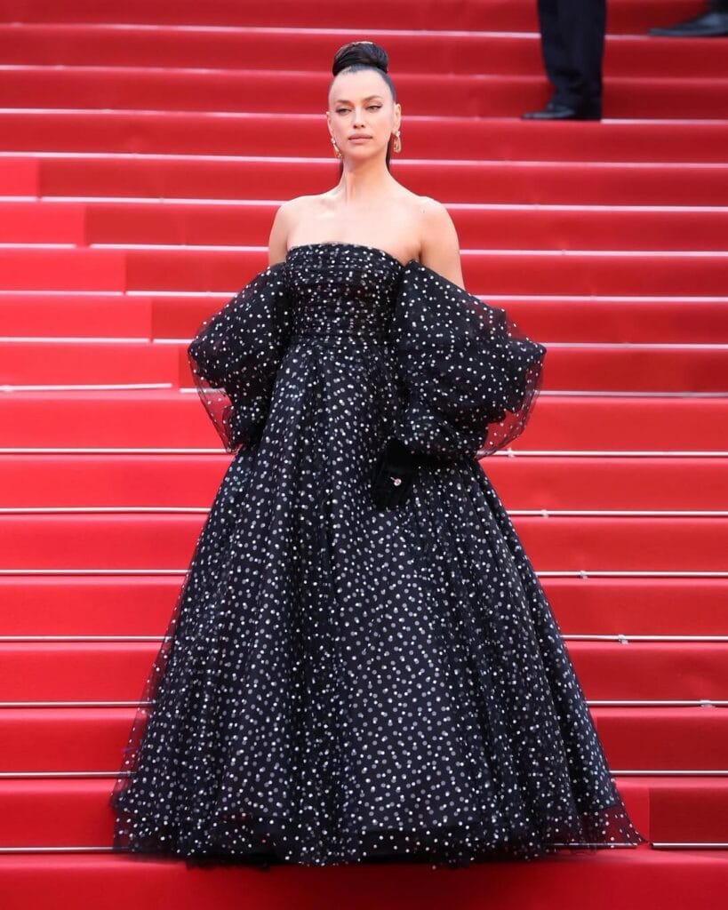 Irina Shayk utilizó vestido en color negro con lunares blancos de la firma de Armani Privé colección aw19 couture. Además, su peinado licked back a un moño alto y el cabello suelto atrás fueron un diseño muy bold para la celebridad.