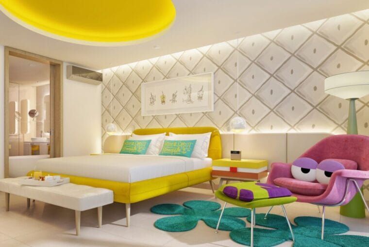 El Hotel Nickelodeon en Riviera Maya ofrece 12 tipos de habitaciones entre suites, penthouses y villas, completamente de lujo. Todos los alojamientos son temáticos del mundo Nick y cuentan con vista al mar, dos baños y alberca.