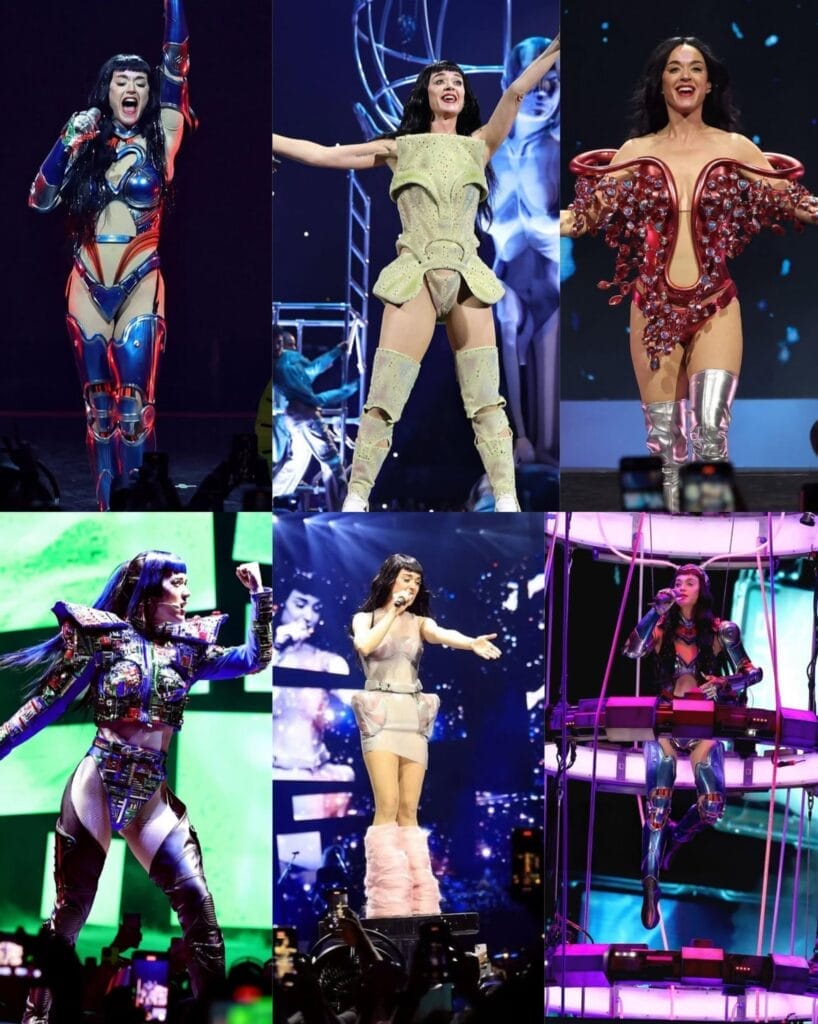 El storytelling visual de los vestuarios giró en torno a conceptos espaciales, galaxias y figuras fuera de este mundo, todo con ese sello divertido y colorido que ha definido la estética de Perry desde sus inicios. Además, muchos de estos atuendos no solo fueron parte de su imagen, sino que también se integraron a la escenografía, formando parte activa del show.