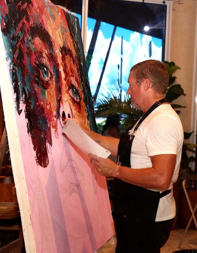 El toque artístico corrió a cargo del pintor belga Peter Terrin, quien realizó un performance en vivo mientras sus obras —vibrantes y llenas de energía caribeña— adornaban el restaurante del club. Su distintiva técnica de heavy body acrylics aporta textura, movimiento y color al espacio, integrándose con el entorno natural del mar y la arena.