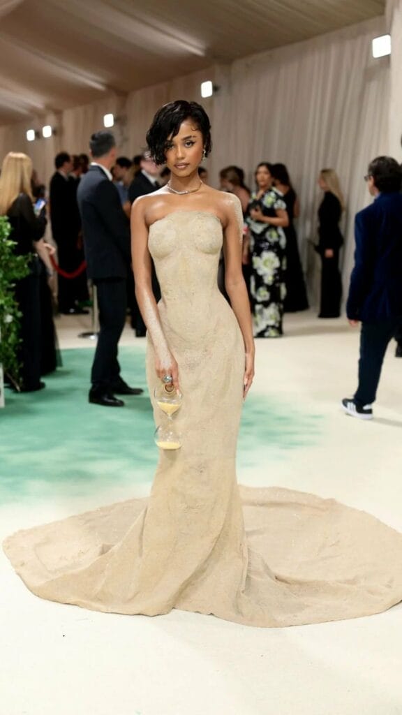 En un diseño de Balmain, Tyla podría mirarse como en un vestido muy simple, pero justo en el Jardín del tiempo del Met Gala 2024, la figura de reloj de arena y el tono beige acentúan el taste de la cantante.