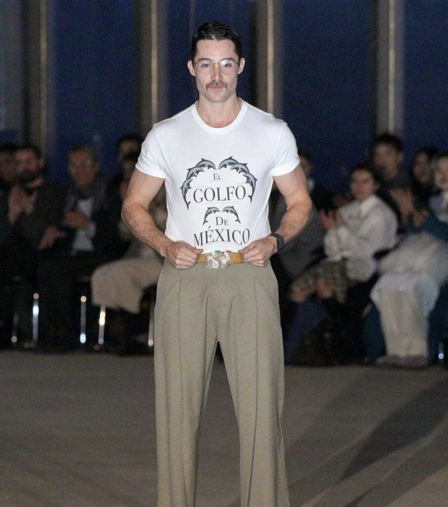 Uno de los momentos más sorprendentes de la New York Fashion Week 2025 fue la chaqueta confeccionada con 2,500 plumas de gallo, un símbolo de fuerza y masculinidad en la cultura mexicana. Para cerrar el show, Campillo lanzó un contundente mensaje político al desfilar con una camiseta estampada con “Golfo de México”, una respuesta directa a la controvertida orden de renombrar esta zona.